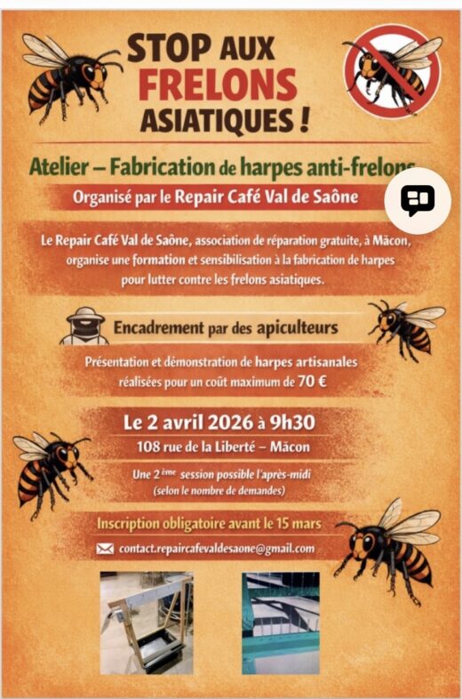 Le Repair Café Val de Saône association de réparation gratuite organise une formation et sensibilisation à la fabrication de harpes pour lutter contre le frelons asiatiques. Ce sera le 2 avril 2026 à MACON àEn savoir +